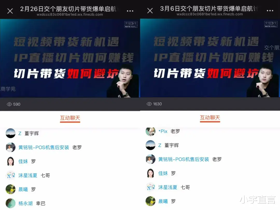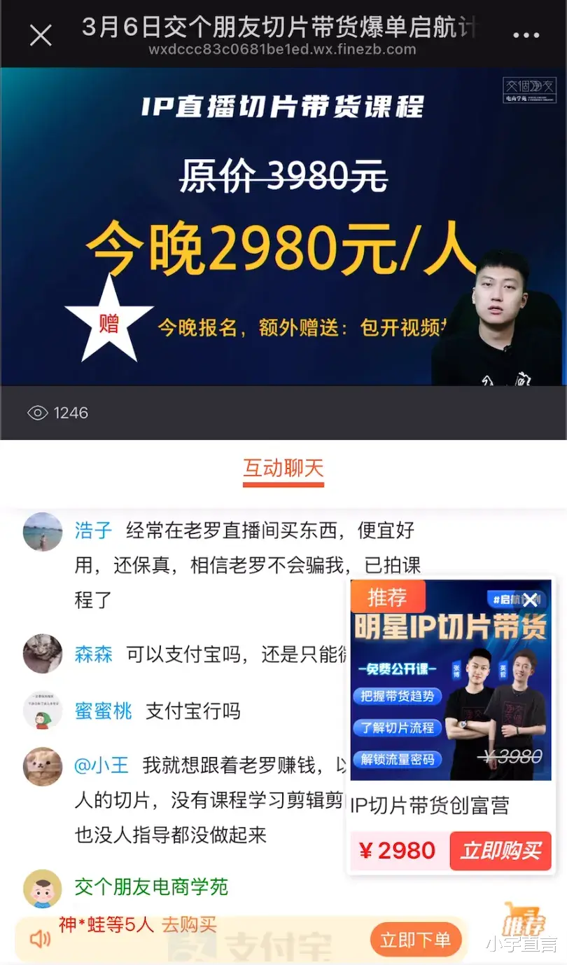 这意味着,交个朋友电商学苑的罗永浩切片授权讲解课程不仅涉嫌用录播内容伪装成实时直播,从而误导用户,其评论区也存在人为操控的迹象,刻意营造虚假的直播人气氛围。在新用户不知情的情况下,这种设计会让他们误以为评论区滚动的是实时互动评论,进而影响判断,诱导其作出下单决策。