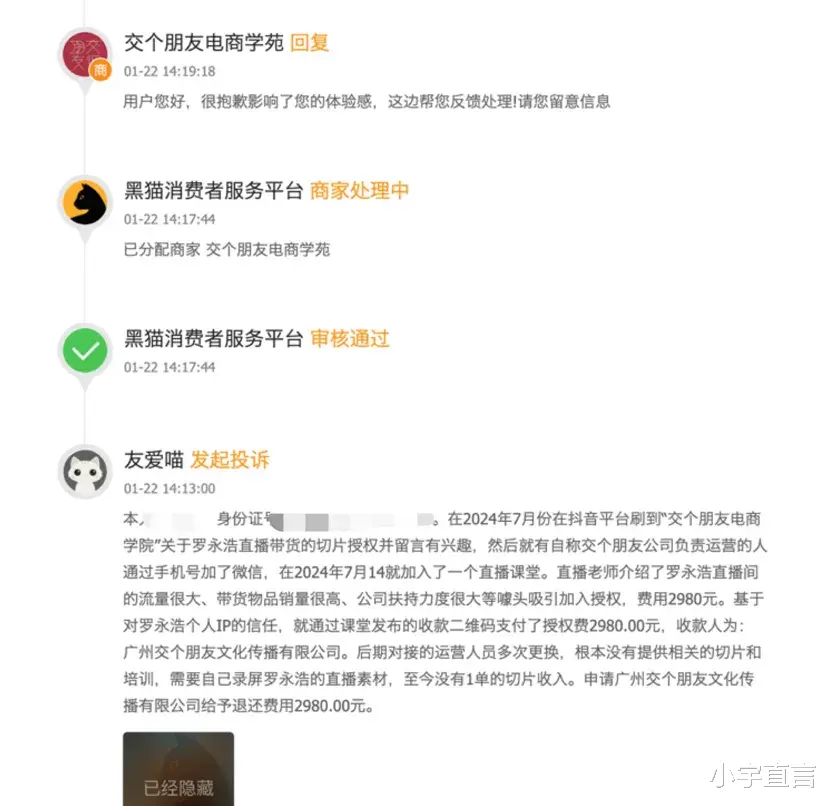 黑猫投诉网站上,一位要求退还学费的学员表示,加入交个朋友电商学苑的切片带货培训后,后期对接的运营人员多次更换,根本没有提供相关的切片和培训,“需要自己录屏罗永浩的直播素材”,并且截止到2025年1月22日,“没有一单的切片收入”。另一位希望退款的学员也提及,授课老师并不是一对一教学,回复问题慢,罗永浩的切片素材少、更新慢,素材和交个朋友主账号相差太大。
