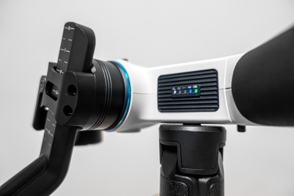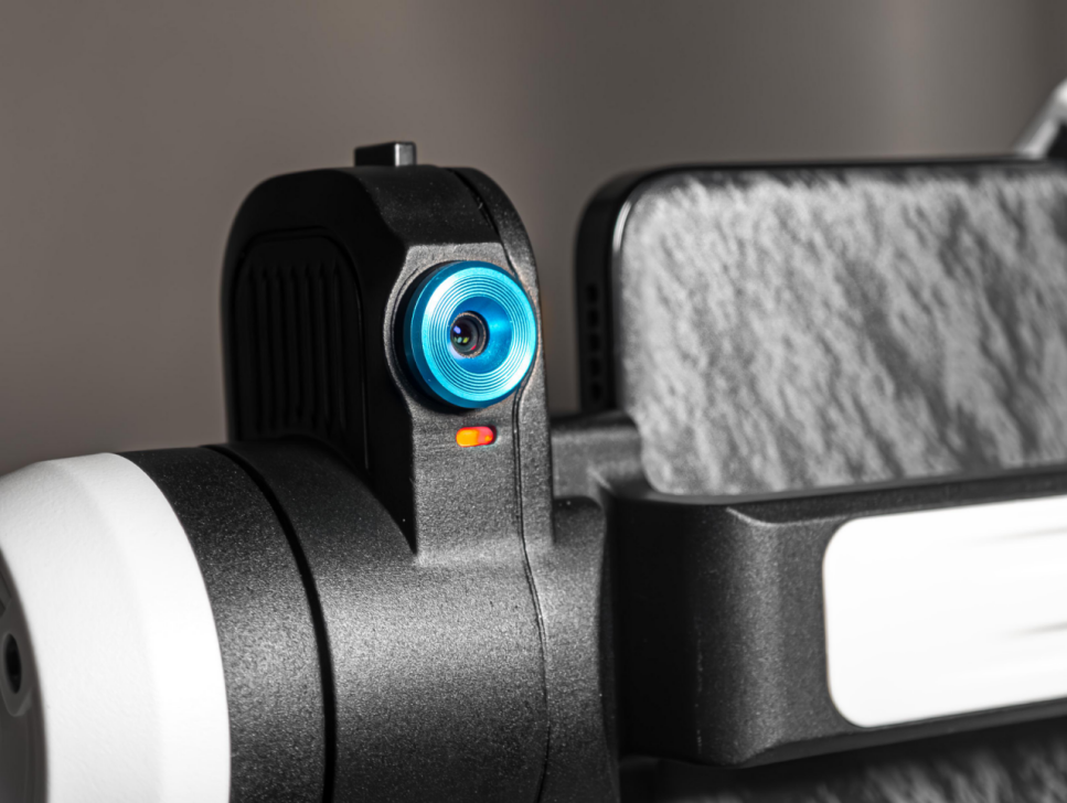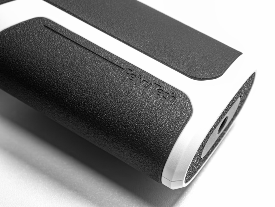 飞宇蝎子Mini 3 Pro稳定器整机用了黑白撞色的机身设计,航向角转轴的交界处以一圈天蓝色金属圈提神点缀,航向轴支持360度整圈无限旋转。