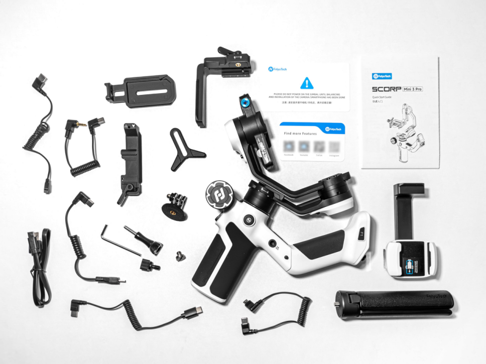 此外,配合相机使用的快拆板、针对较重镜头使用的镜头支架、配合手机使用的手机夹、配合运动相机使用的GoPro转接头、内六角工具和螺丝、三脚架、说明书、提示卡等配件也是一应俱全。