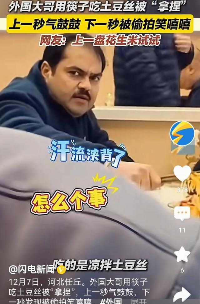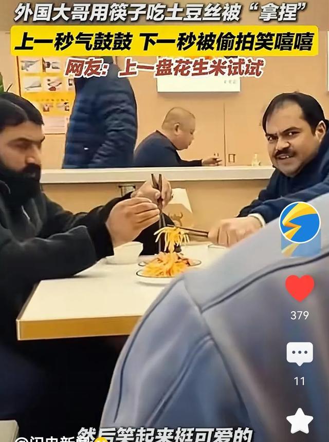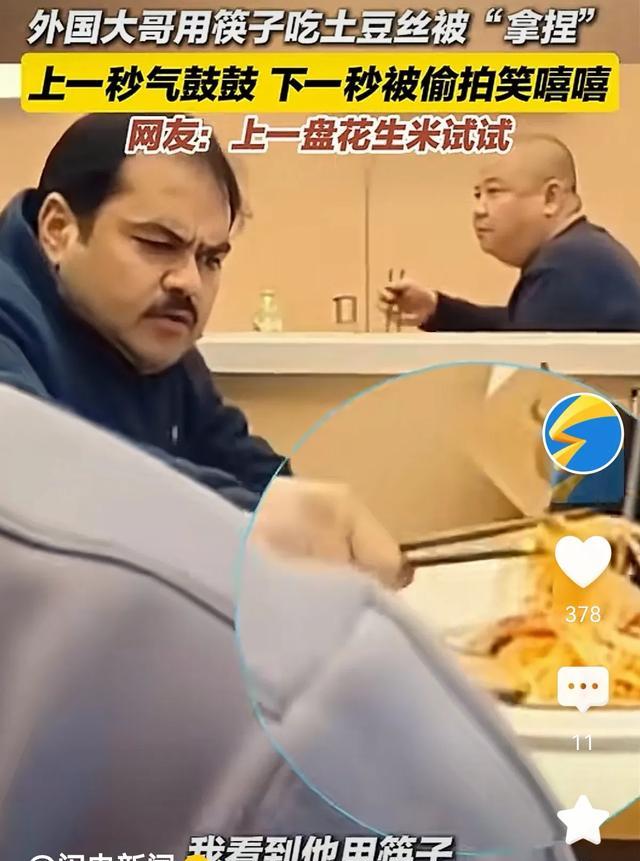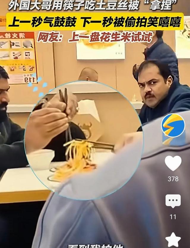 还好不是一盘花生米。外国大哥用筷子吃土豆丝被“拿捏”,上一秒气鼓鼓,下一秒被偷拍笑嘻嘻。大哥那模样,不像是在吃土豆丝,更像在练功。