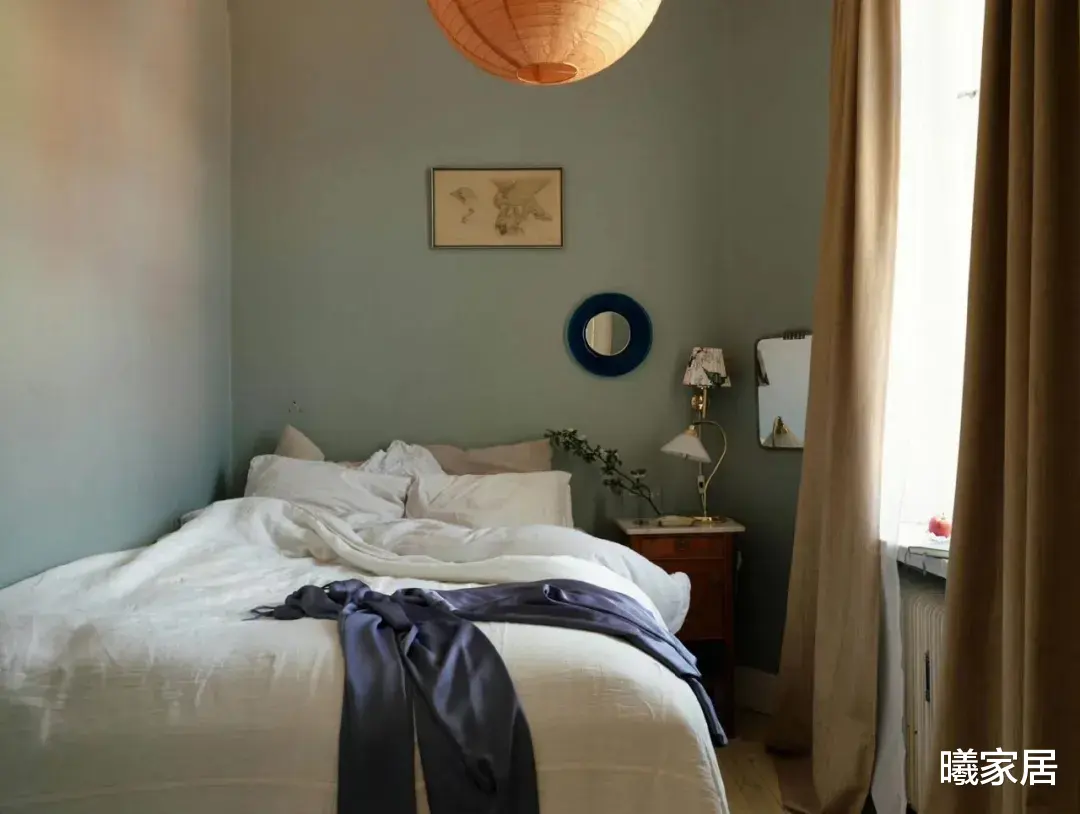 有高调的复古,也有低调的,复古不是大户型的专利,韵味有了就对了。首先墙面的灰色颜色定下空间沉稳的基调,没有靠背的床加上浅色床品,传递出舒适干净的感受,也让这里变得没那么拥挤。再搭配上棕色亚麻窗帘,同款纸质灯罩配上黄铜灯饰,简单的精致中散发着迷人的复古感,慵懒的风仿佛吹进了梦乡。