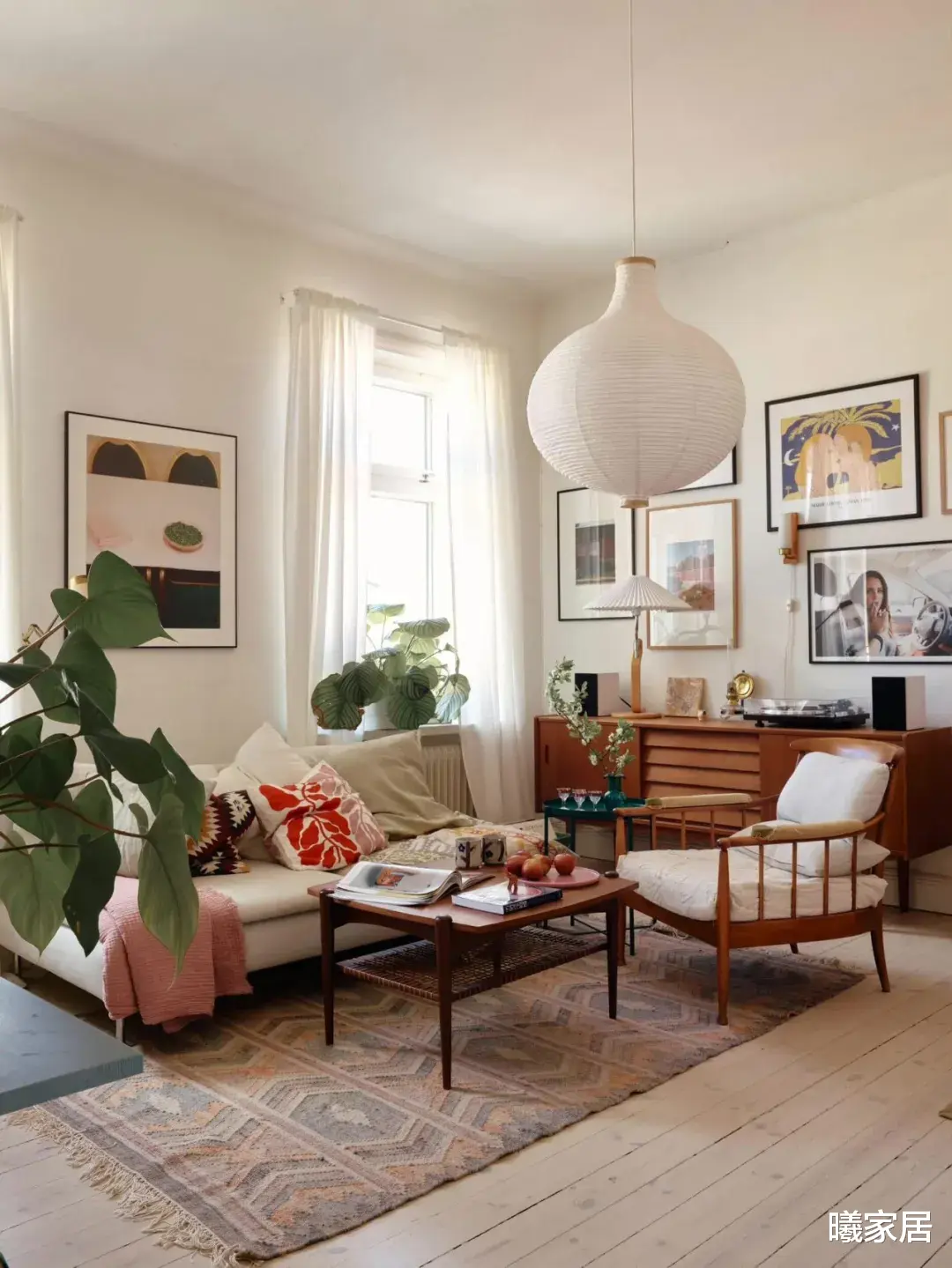 如果想要打造出复古的北欧风,首先就要去掉原本的素色基调,换上更深一些的木色、黄色、红色这类饱和度较高的色彩。这个小空间,就通过复古的柜子、扶手椅、地毯、挂画等,通过搭配来呈现出色彩多而不乱的有质感、有格调的复古空间。