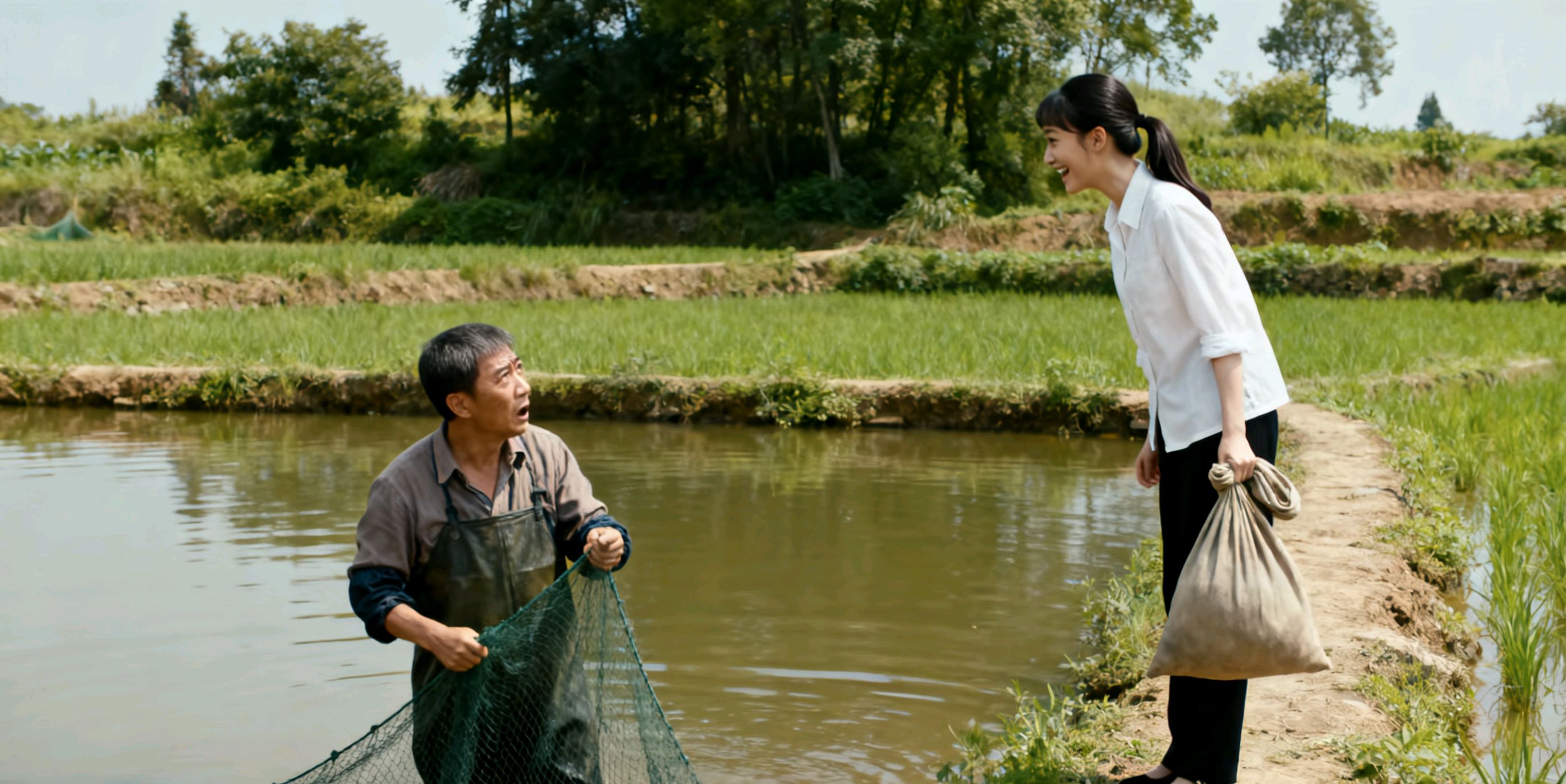 我回头一看,愣住了。是苏晚晴,她穿着一件白色的衬衫,一条黑色的裤子,头发扎成了马尾,比上次见的时候精神多了,只是脸上还有点腼腆。她手里拎着一个布袋子,站在田埂那头,看着我。