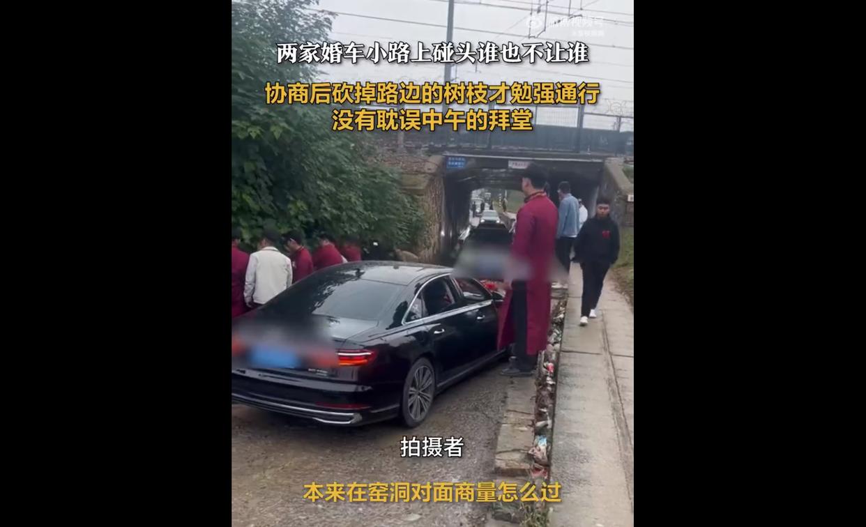 按照老一辈的说法,这原本是"喜冲喜"的吉兆,但现实中的道路空间却让两支车队进退维谷。最初的对峙中,双方亲友都坚持"婚车不能倒车"的传统观念,生怕因此影响新人的婚姻运势。僵持了一段时间后附近的村民取来了镰刀,帮忙砍掉了路两边的树枝,这才让两辆婚车并排通过。