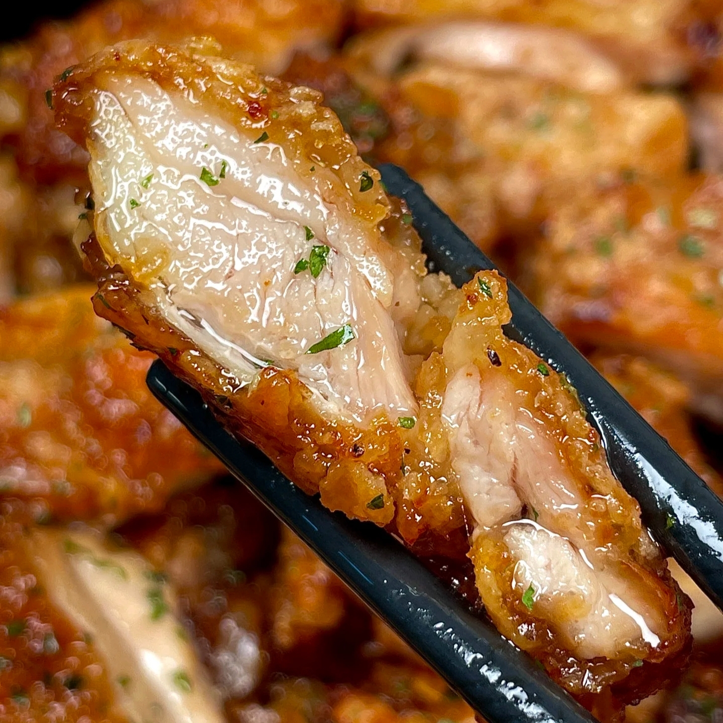 刚出锅的鸡排外皮布满琥珀色裂纹,筷子轻敲“咔嚓”作响。咬破脆壳的刹那,肉汁裹着蜂蜜的甜香在口腔炸开,蒜香在尾调若隐若现,连骨头都浸透了焦糖香。搭配冰镇气泡水,幸福感直冲天灵盖!