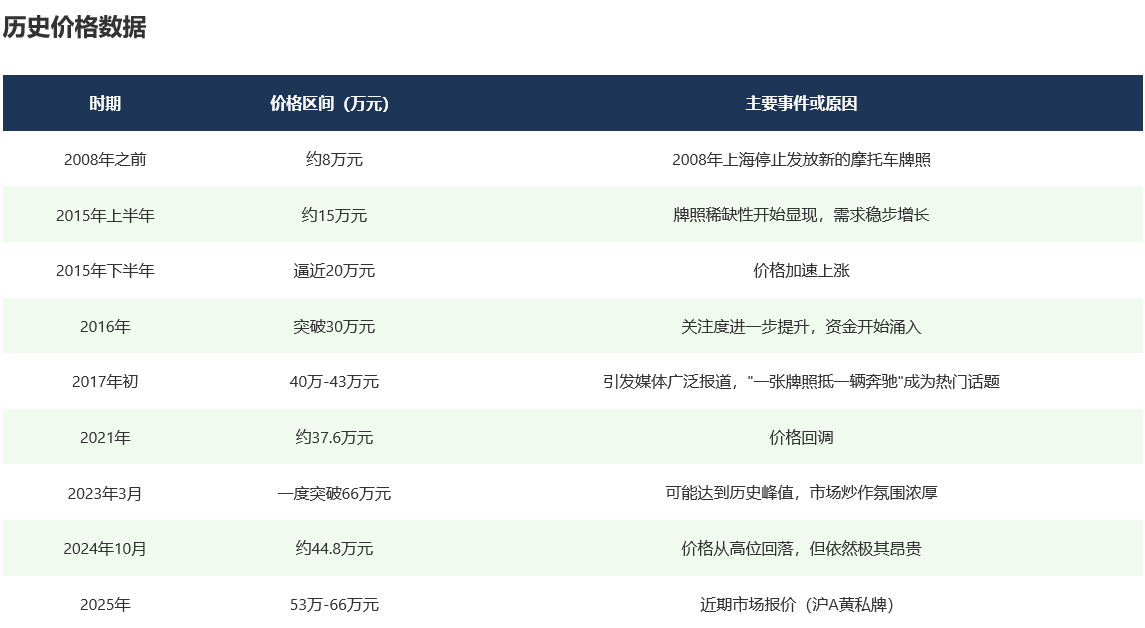 1. 绝对的稀缺性:这是最根本的原因。上海在2008年就停止了发放新的摩托车沪A牌照。这意味着市场上的牌照数量是一个固定存量,只减不增。早期甚至有近三分之二的沪A黄牌通过“摩转汽”变成了汽车牌照,进一步减少了存量。物以稀为贵,当想要的人远多于市场上能交易的牌照数量时,价格自然一路走高。