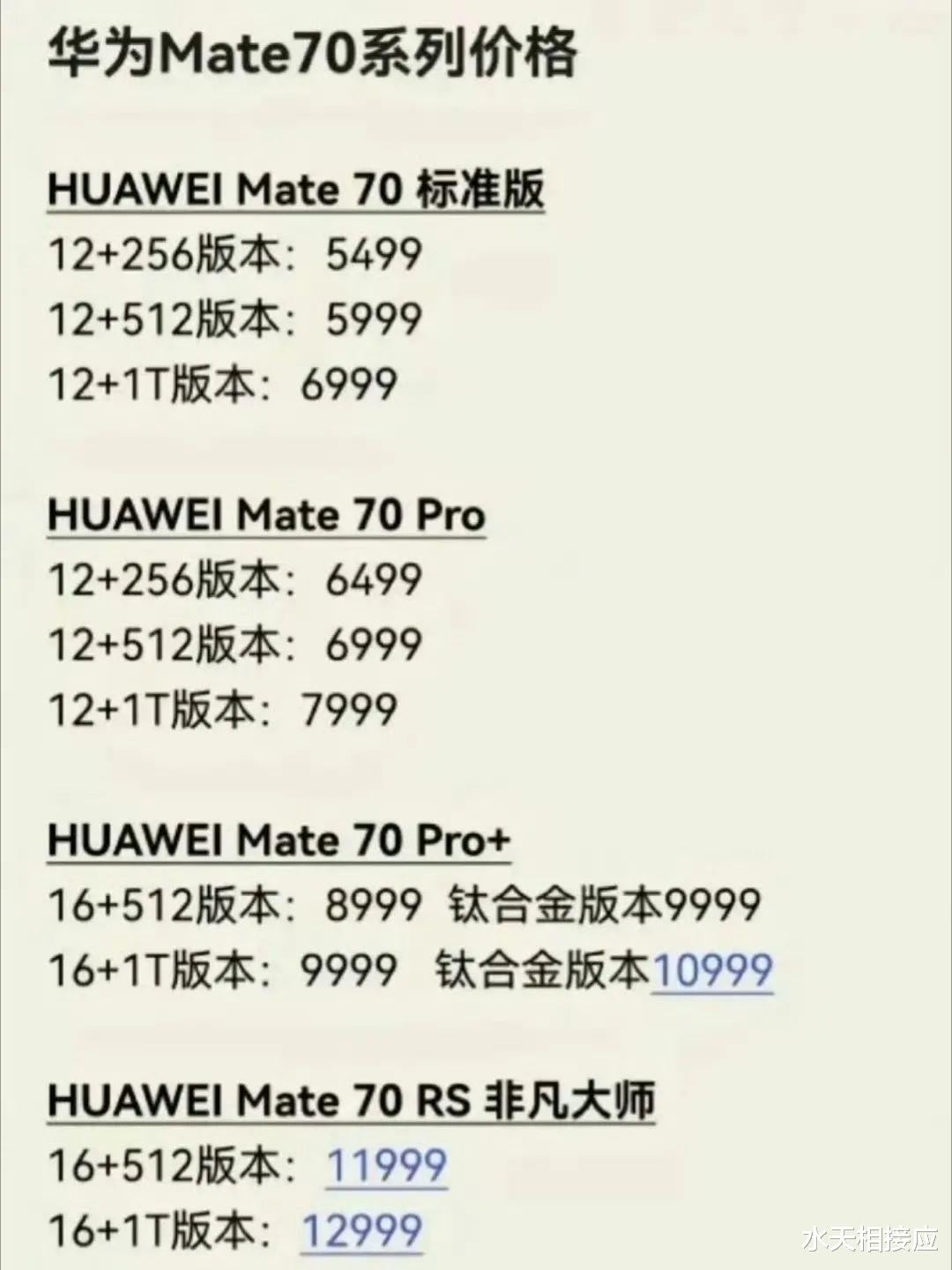 华为Mate70搭载12GB运存,提供256GB/512GB/1TB三种存储,售价分别为5499元、5999元、6999元。华为Mate70Pro搭载12GB运存,提供256GB/512GB/1TB三种存储,售价分别为6499元、6999元、7999元。Mate70Pro+搭载16GB运存,提供512GB/1TB两种存储,售价分别为8999元、9999元。(新增钛合金版本,售价高1000元)Mate70RS搭载16GB运存,提供512GB/1TB三种存储,售价分别为11999元、12999元。