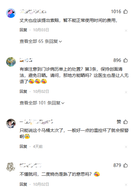 一网友称:“丈夫也应该提出索赔,暂不能正常使用时间的费用……”另一网友也附和:“小林的丈夫也应该提出误事赔偿!”还有人问:“误工费怎么算的?”更有网友发出感叹:“当人懒得连屁股都不想擦的时候,意外就必不可免的会发生的!”……