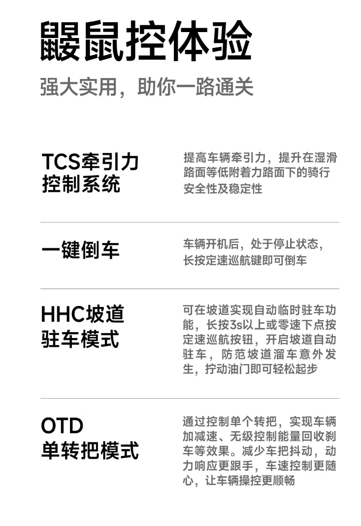 在安全制动性方面,九号电动M95C+带来了全套的鼹鼠控功能,像 TCS 牵引力控制系统、OTD 单转把模式、HHC 坡道驻车、一键倒车等功能都安排上了!加上能够稳定刹车的前后双碟刹制动,急刹时不易甩尾漂移,即使上班的时候遇到下雨天也不用过分担心骑行的路上打滑!更何况它还有3.5 - 10 宽体后胎,配合上后轮配置五档可调减震和高舒适感座垫,能根据骑行情况自行调整避震档位,即使通勤时间久也能保证屁股不疼!