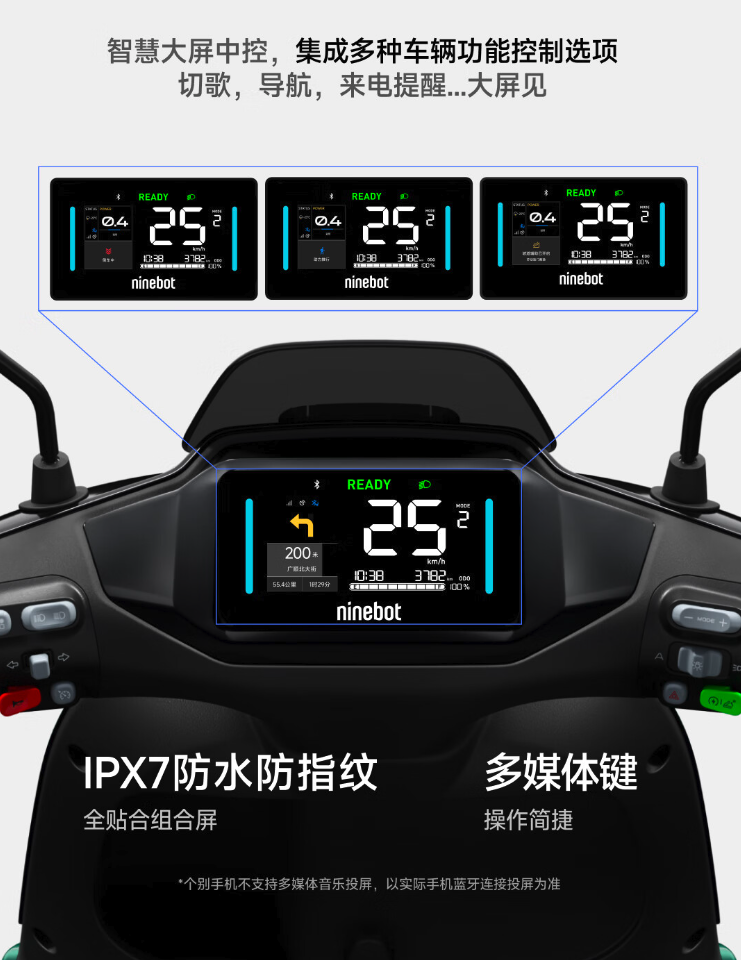 同时九号电动M95C+还支持全场景智能辅助,能够实现定速巡航,座垫感应,倒车等在内的多种功能。最贴心的是,为了保证用户的使用体验,九号电动M95C+这个仪表采用的是全贴合组合屏,支持IPX7防水防指纹,只能说九号确实贴心!车身的光感大灯近光亮度达 8500cd,远光亮度达 25000cd,大幅提升夜间骑行的安全性。