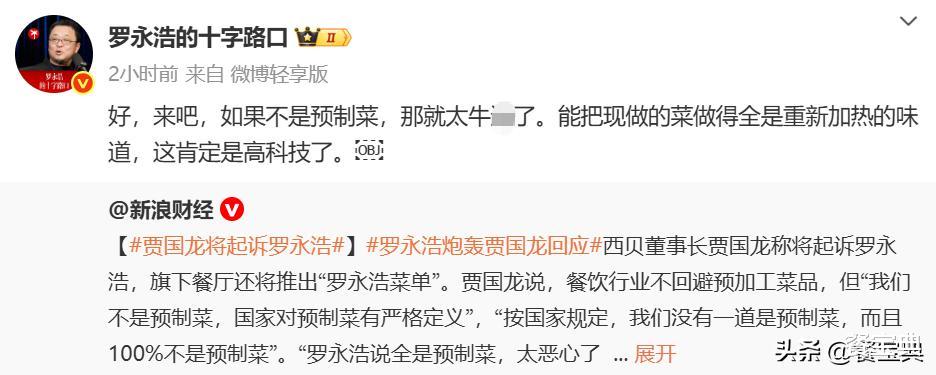 对于贾国龙的表态,罗永浩连发数条微博,先是表示“好,来吧,如果不是预制菜,那就太牛×了。能把现做的菜做得全是重新加热的味道,这肯定是高科技了”,随后又针对昨日用餐菜品详细进行了点评。