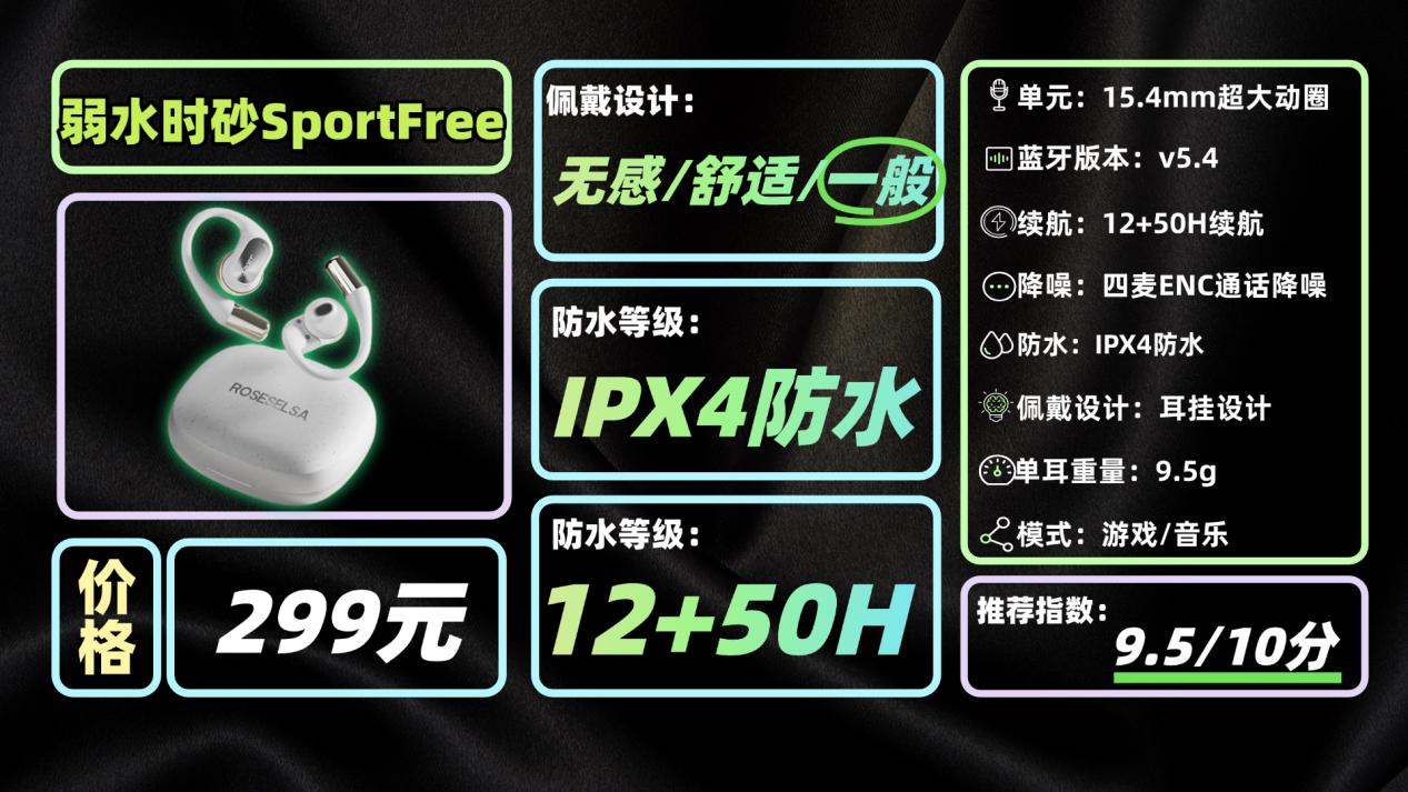 耳机在佩戴方面,它的耳挂做了亲肤硅胶包裹,柔韧性很好,能适配不同耳型,长时间运动也不会磨耳朵。防水等级升级到IPX6,不管是大量出汗还是户外突发降雨,都不用慌。续航上,单次使用能达到12小时,充电仓加持下总续航50小时,超长的续航时间可蛮足一些户外运动需求。音质上采用15.4毫米的超大动圈定制动圈单元,三频表现均衡,人声清晰、低频有力,很适合运动时听节奏感强的音乐。这个价位能兼顾佩戴、防水和音质,性价比还是不错的。