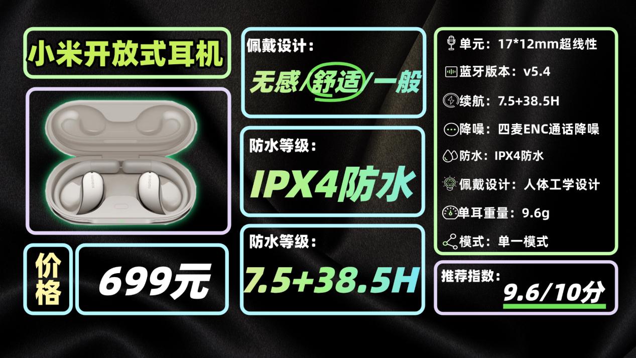 预算来到600档,这款小米开放式耳机很适合小米用户。佩戴上非常舒适,耳挂的设计很有科技感,单耳才9.6克,用了液态硅胶包裹的镍钛记忆合金,能随意弯折还不变形,戴久了不压耳,戴眼镜运动的朋友也能轻松适配。防水达到IPX4级,日常运动出汗、防尘完全没问题。音质上是定制17*12mm超线性单元,低频饱满、中高频通透,配合反向声波防漏音技术,自己听得清,旁人也不尴尬。续航单次7.5小时,充电仓总续航38.5小时,满足日常运动完全够用。小米生态用户还能联动弹窗,使用感更流畅,追求运动轻盈佩戴和品牌适配的选它准没错。