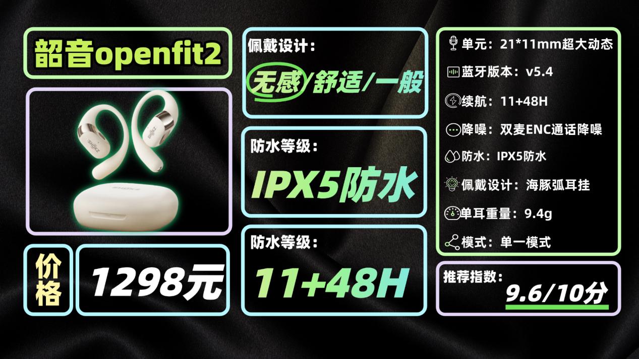 最后是1298元的旗舰款——韶音openfit2。佩戴堪称顶级,贴耳处用了双层硅胶,内层是超零度硅胶,搭配海豚弧耳挂和内嵌的0.7mm柔性钛合金丝,戴上就像“量身定制”,自适应不同耳型,长时间运动也毫无不适感。防水达到IPX5级,应对运动大汗和中雨完全没问题。音质上是真的惊艳,Shokz DualBoos双引擎技术加持,搭配21*11mm超大动态动圈,听音方面低频浑厚、高频清亮,还有很强的空间感。续航更不用说,单次8小时,充电仓总续航48小时,一周一充毫无压力。这款的细节拉满。预算充足,想追求极致佩戴和音质的运动党,这款闭眼入!