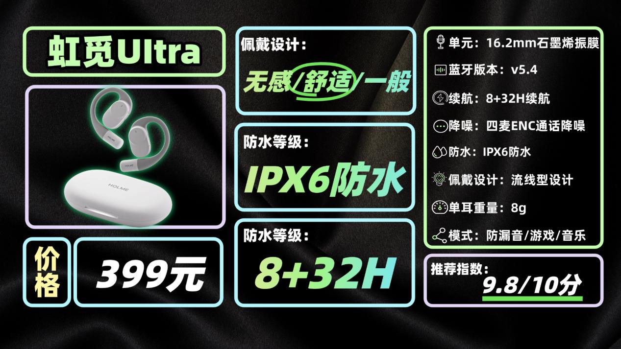 然后是399元的虹觅UItra,实力同样能打。佩戴上,流线型液态硅胶耳挂设计,单耳仅8克,戴在耳朵上几乎没什么负重感,就算长时间佩戴也不会觉得耳朵酸胀。防水等级达到IPX6,户外下雨、出汗以及短时冲淋都无需担心。续航方面单耳可使用8小时,加上充电仓总共能达到32小时,一整天都不用频繁想着充电,放心肆意运动。音质上它搭载了16.2mm的石墨烯动圈单元,音乐里的细微之处都能清晰呈现,不仅实现了高保真效果,三频表现也十分均衡。它调音延续虹觅家的“还原”风格,不会因刻意强化高低频导致声音走样。搭载的H zone空间音效能营造开阔听觉空间,沉浸感大幅提升。特别值得一提的是专属防漏音模式,三击就能快速开启,在健身房使用能很好保障隐私。触片式充电设计也很实用,一定程度解决了传统触电充电不良的问题。这款绝对是运动党五百以内的最优选,适合绝大多数人。