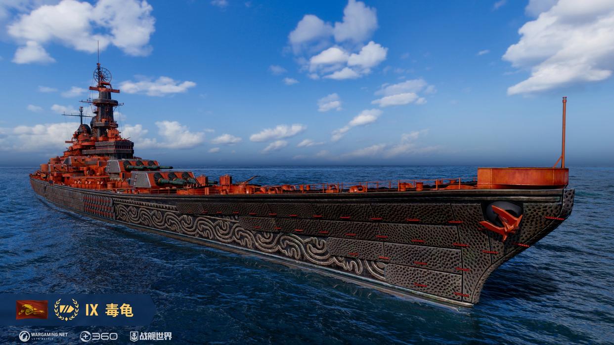 毒龟的原型舰为是M系9级战列舰衣阿华,作为三国联动的强力战舰之一,不仅外观设计拉满,船体以黑铁为基底,雕刻着大面积波浪花纹,甲板和上层建筑涂成朱红色,舰身覆盖的铁质甲片还有极具质感的凹坑纹理,古朴中带有奇幻,艺术感直接拉满。同时,它在实战中也有着十分出色的表现。