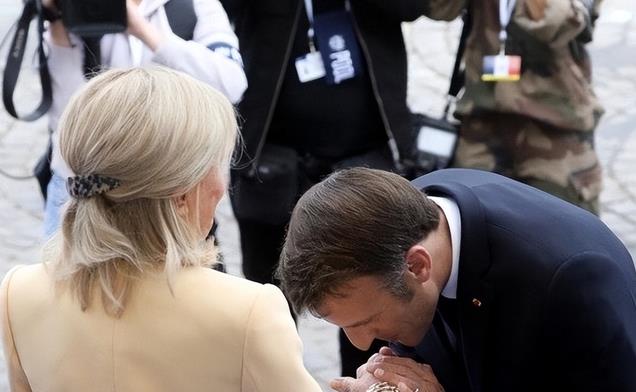 马克龙从不惧镜头拍摄,大大方方的亲吻爱妻的手指。
