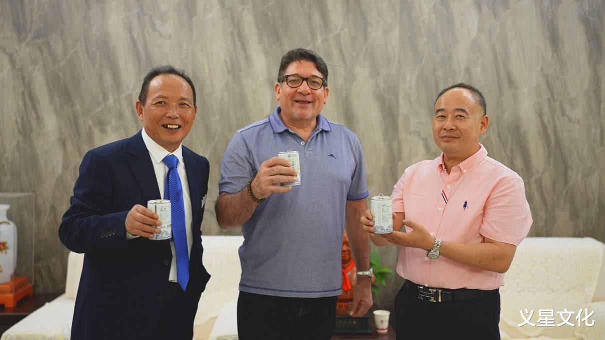 (插图2:百草饮品牌创始人丁天旭,市场部总经理贺正军和巴拿马驻中国广州总领事Roger Manuel Alvarado 罗杰·曼努埃尔·阿尔瓦拉多先生共同品鉴百草饮产品)