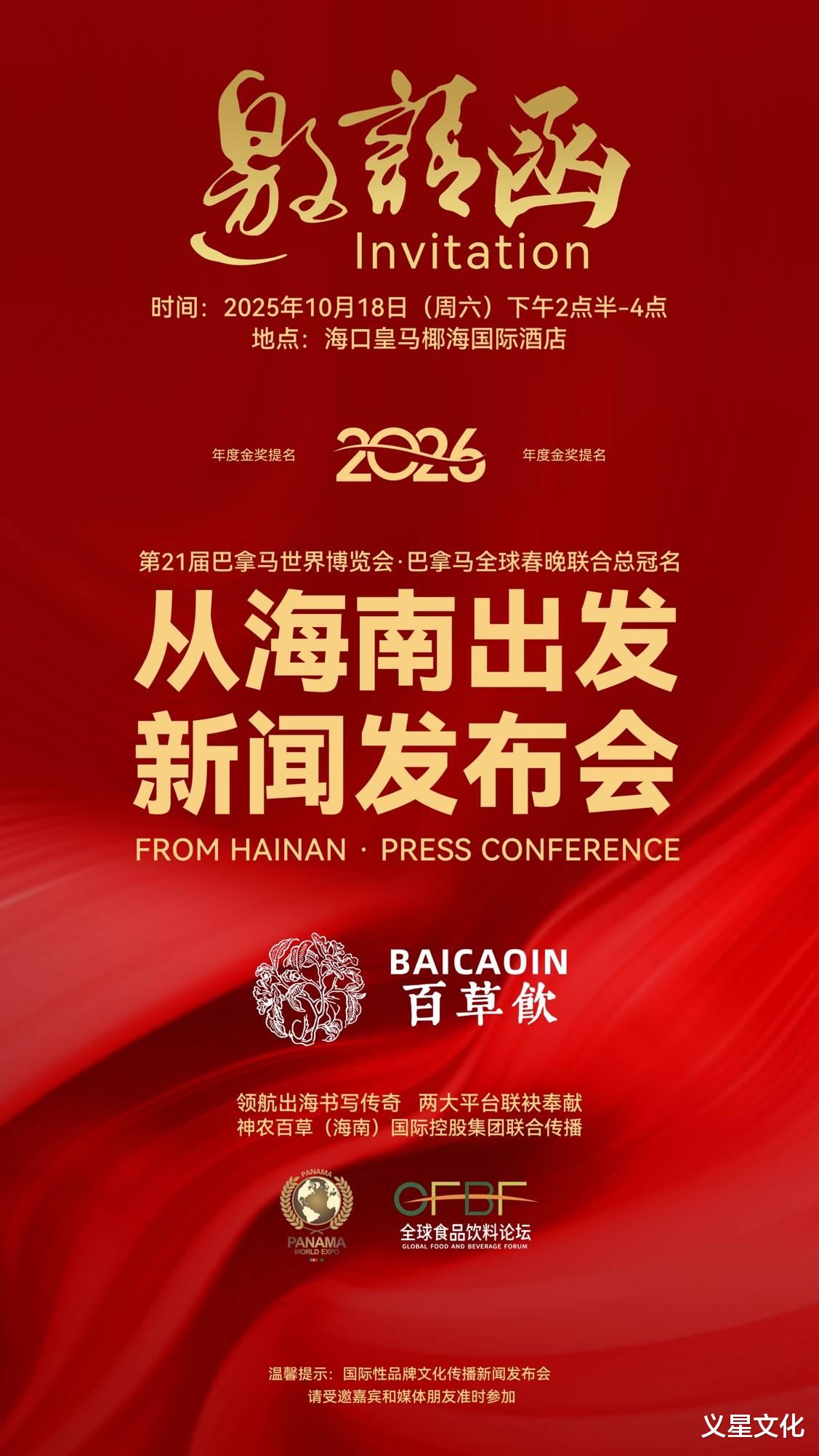 2026·第21届巴拿马世界博览会·巴拿马全球春晚活动将在2026年2月 “中国年新春佳节”期间在巴拿马共和国首都巴拿马城隆重举办。巴拿马世界博览会国际组委会传播团队将对「百草饮」产品进行一系列高规格世界级包装和推广,并将为神农百草(海南)国际控股集团「百草饮」品牌产品设计制作价值过百万、全球最先进的数字实景博览馆和数字实景展厅,面向海内外进行产品推广传播。