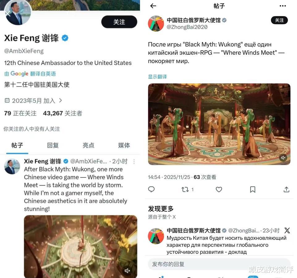 “网易双侠”走红海外,引得中国驻美大使谢峰和中国驻白俄罗斯大使馆相继转发喜人的战绩,把优秀的中国文化传递到海外千万玩家的心中。