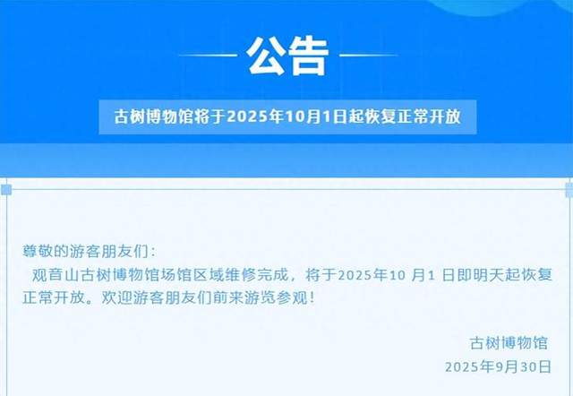 2025年9月30日,东莞观音山古树博物馆场发布公告称,观音山古树博物馆场馆区域维修完成,将于10 月1 日起恢复正常开放。