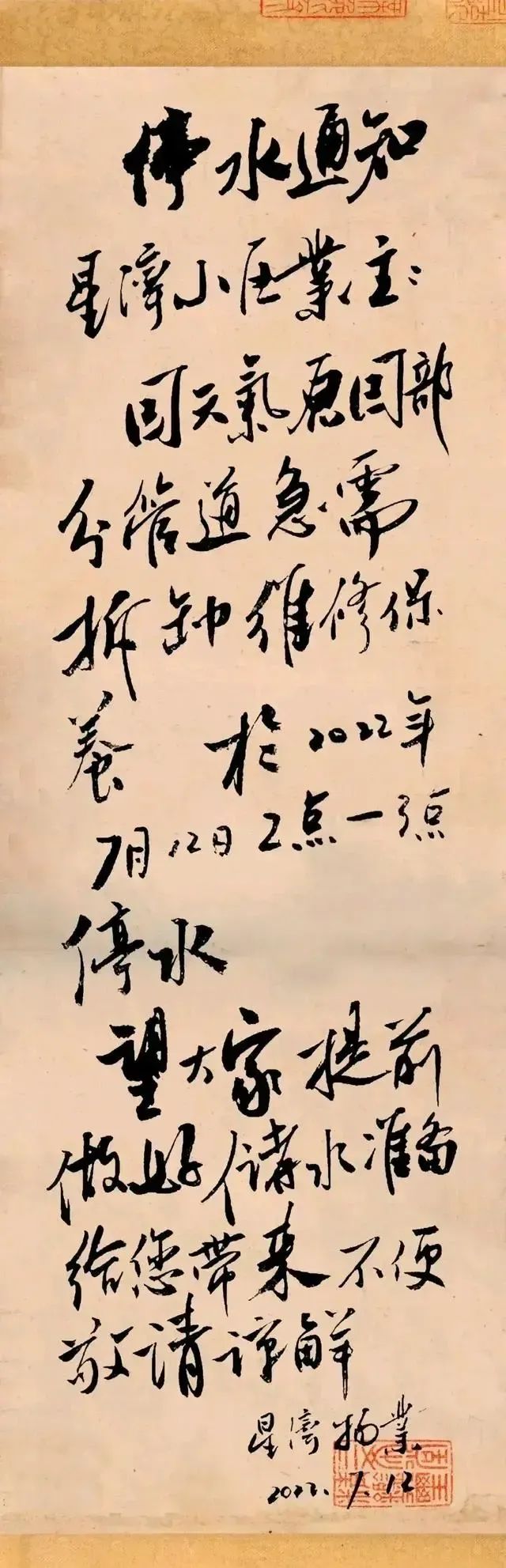 第一件作品就是《停水帖》。虽然作者是不详,但这并不能掩盖作品的卓越之处。清丽酣畅的行书笔画,恰到好处的布局以及娴熟的笔法,凸显出了传统艺术的独特风范。这是一个不需要名家、不需要大师的作品,由一个社区工作者书写而成。