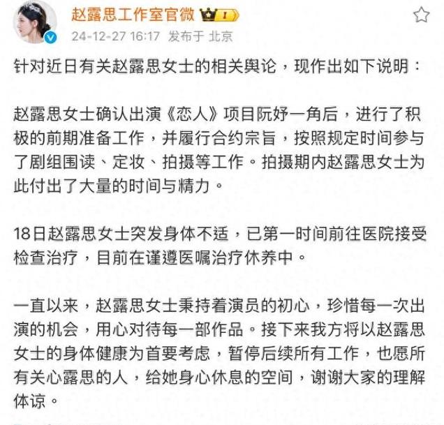 赵露思突然病倒,工作室事发至今只发了一篇声明,当中提到的是她在18号突然身体不适。