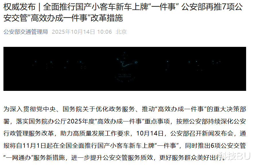 公安部在今天召开新闻发布会,通报将自11月1日起在全国全面推行国产小客车新车上牌“一件事”,同时推出6项公安交管“一网通办”服务新措施,进一步提升公安交管服务质效,更好服务群众美好出行。