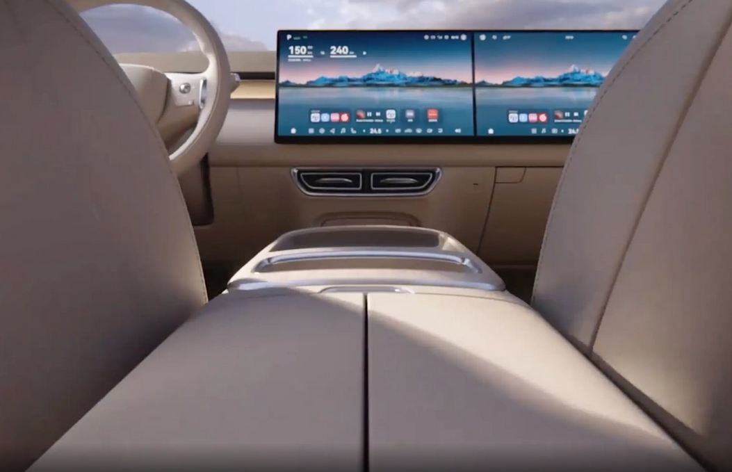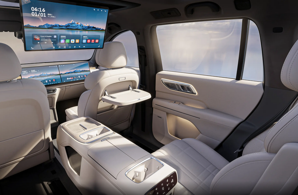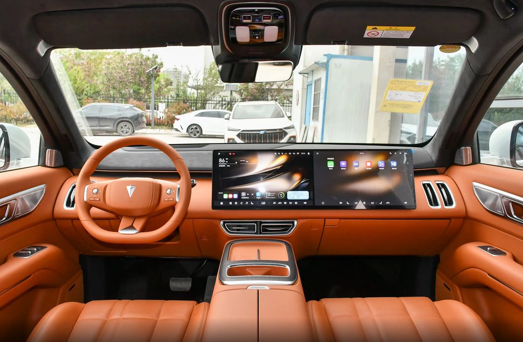 内饰方面,深蓝S09的座舱提供松石米、曙光橙多种配色风格,不同审美消费者都能从中找到适合自己的座舱配色,大面积的软皮中间夹杂着木纹饰板点缀,高级感直接拉满。中控屏与副驾娱乐屏为一体式设计,很难不让人联想到理想L系列,不过一款好的设计只要能被大部分人接受也未尝不可。触控屏搭载华为HarmonyOS系统,UI界面为卡片式,主菜单栏下方还集成了多个快捷键,使用中相当便利。此外,后排的21.4英寸吸顶屏也支持语音控制,用户动动嘴就能获取对应信息,智能化程度相对较好。