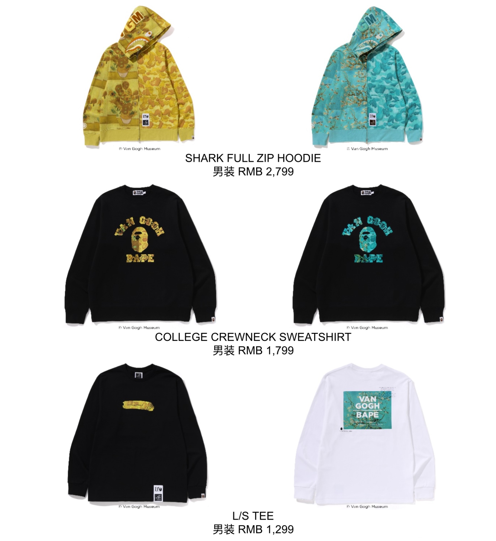 联名服装涵盖鲨鱼拉链帽衫、圆领卫衣、长袖及短袖TEE等单品,双方为此番合作打造了一款独特的迷彩图案「OIL PAINTING CAMO」,以《向日葵》与《盛开的杏花》两幅名画为灵感启发。系列包含三款风格迥异的短TEE单品。其中纯白色款以BAPE®︎标志性APE HEAD为画布,无缝融入 6幅按时间线挑选的梵高画作;背面则印有梵高写给提奥信件中的肺腑真言。每件TEE都被装在一个以海报画筒为灵感的特别收藏盒中。