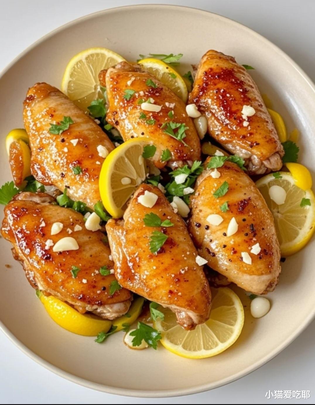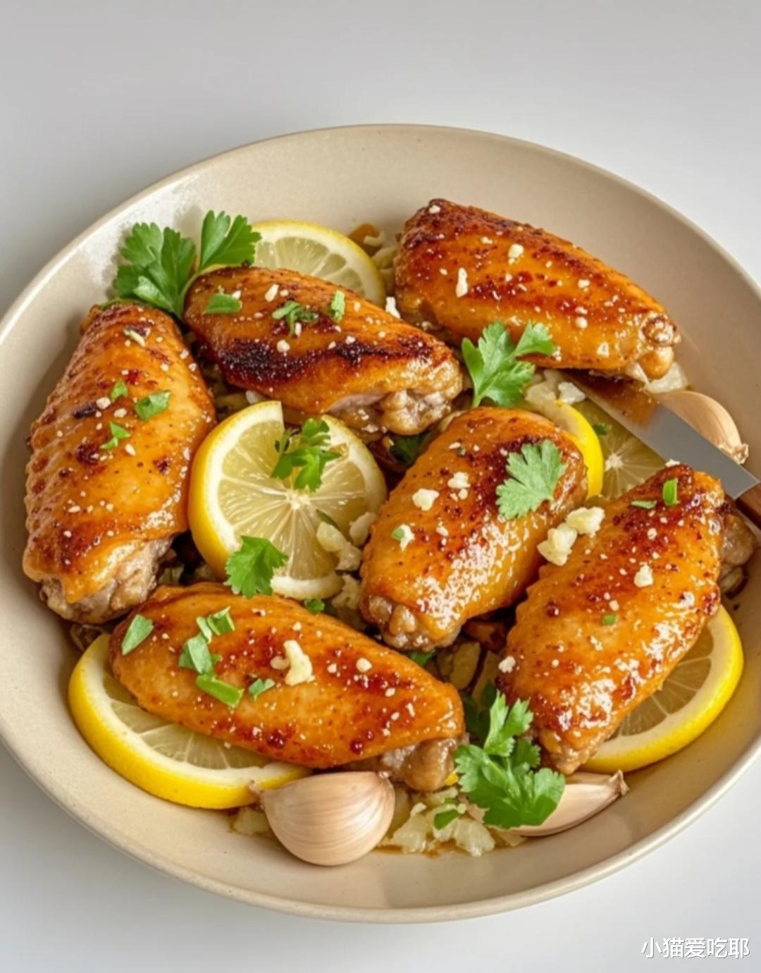 一旦鸡翅出锅,铺上新鲜披萨草或欧芹做点缀,仿佛瞬间提升了颜值,简直就是餐桌上的“自带光环”的神仙之作!让人垂涎欲滴的金黄色外皮,伴随着诱人的蒜香与柠檬的清新气息,在味觉与视觉的双重冲击下,一口下去,外焦嫩滑的口感与满满的鸡汁瞬间迸发,仿佛在唤醒你沉睡的味蕾。