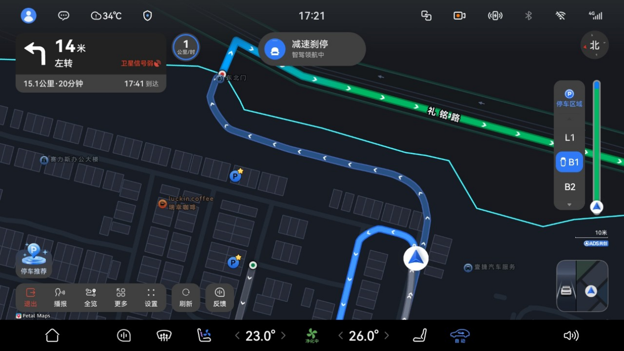 同时,还支持在车位一键启动“领航辅助(NCA)”,园区内外导航能实现丝滑衔接,进出园区时无需手动切换园区与城区界面,全程操作连贯不卡顿,减少操作上的繁琐度。