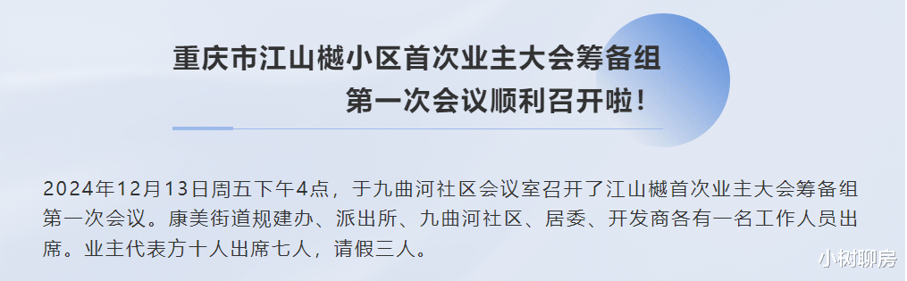 7月19日,筹备组发出公告称业主大会顺利召开并选举产生了首届业主委员会,还公布了会议决定事项。