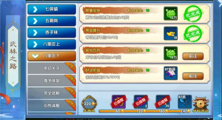 BT 折凳: 通关武林之路八里庄全部任务解锁。
