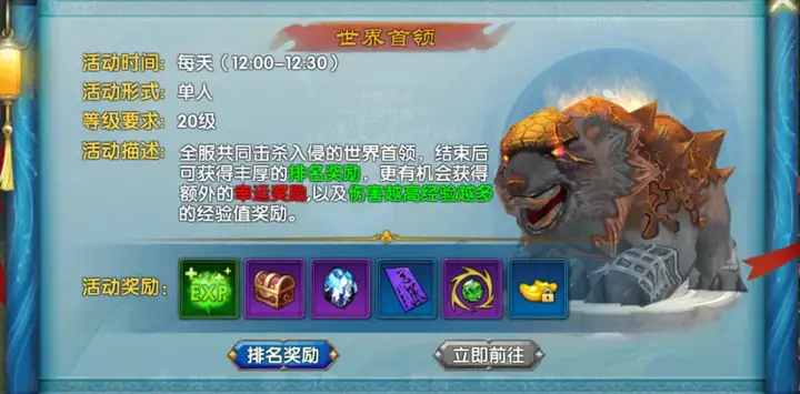 世界首领(12:00-12:30): 每天中午 12 点到 12 点半,世界首领准时刷新。参与击杀世界首领,可获得大量经验,同时还有机会掉落珍贵道具和装备。建议提前组好队伍,与队友配合,提高击杀成功率。