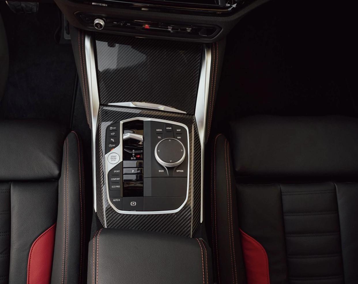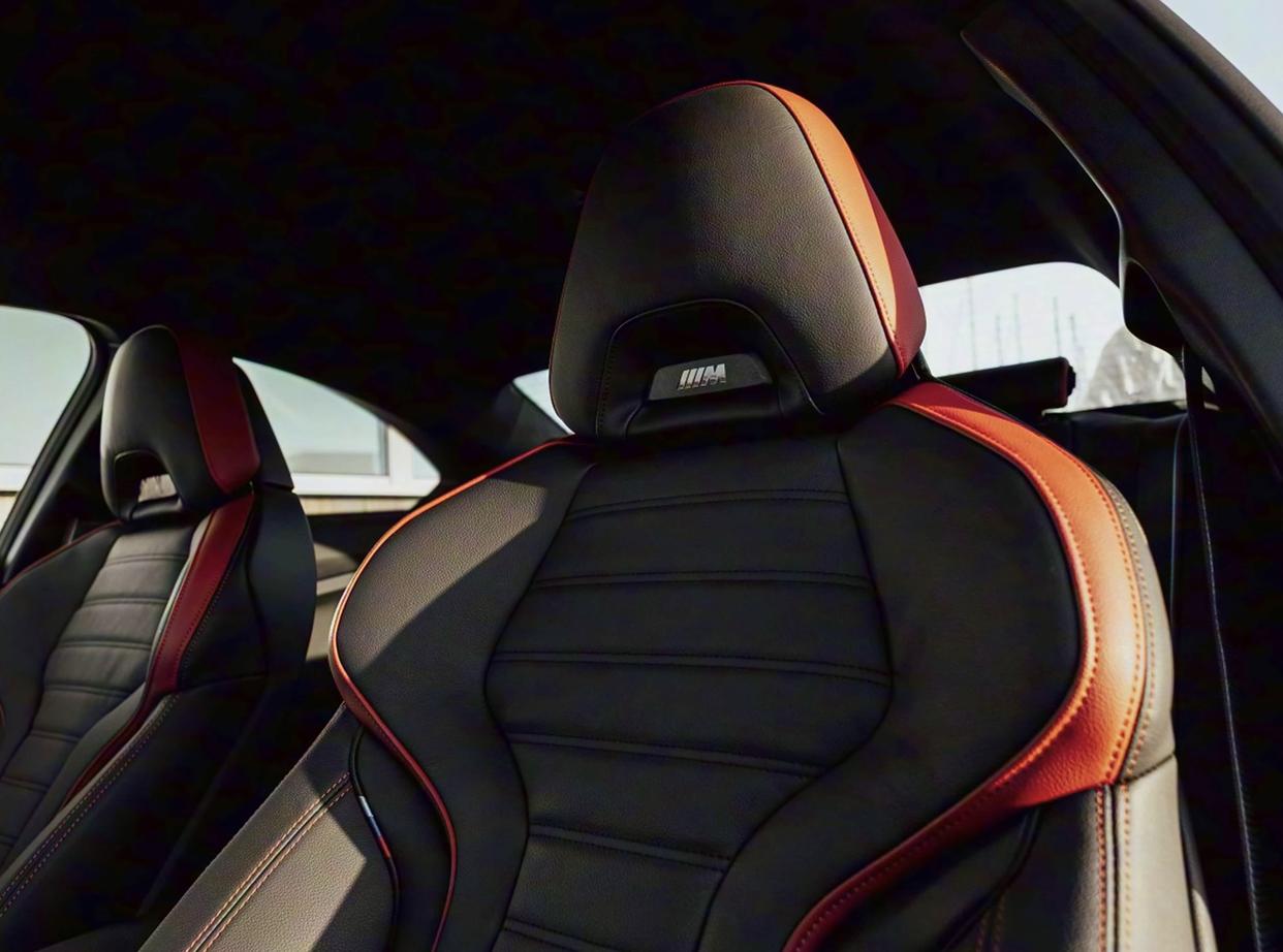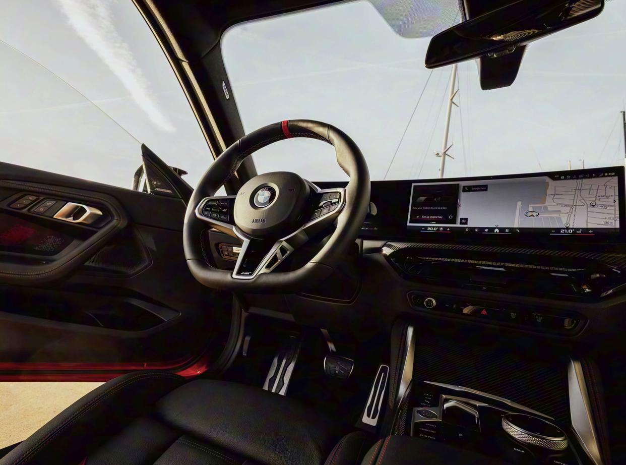 车内采用了比较经典的怀旧风格,相比现款的M2内饰更加朴素,显得更加沉稳、低调。环抱式的座舱采用了宝马M Power的经典设计与布局,大面积黑灰色Alcantara面料/无皮革打孔Veganza材质的铺陈,黑红经典撞色搭配也渲染出更加浓郁的运动氛围。大量黑色碳纤维饰板、银色金属元件以及帆布材质的内侧门把手,带来了满满的性能车“味儿”。科技感方面,中控台配备了10.25英寸+10.7英寸组成的Curved Screen曲面显示屏,为驾驶员提供了最佳的可视角度,正前方哈配备了HUD抬头显示。M运动化方向盘、两侧黑色换挡拨片,再加上全新设计的换挡机构,还有旋钮式驾驶模式切换,也带来了更好的操控体验。