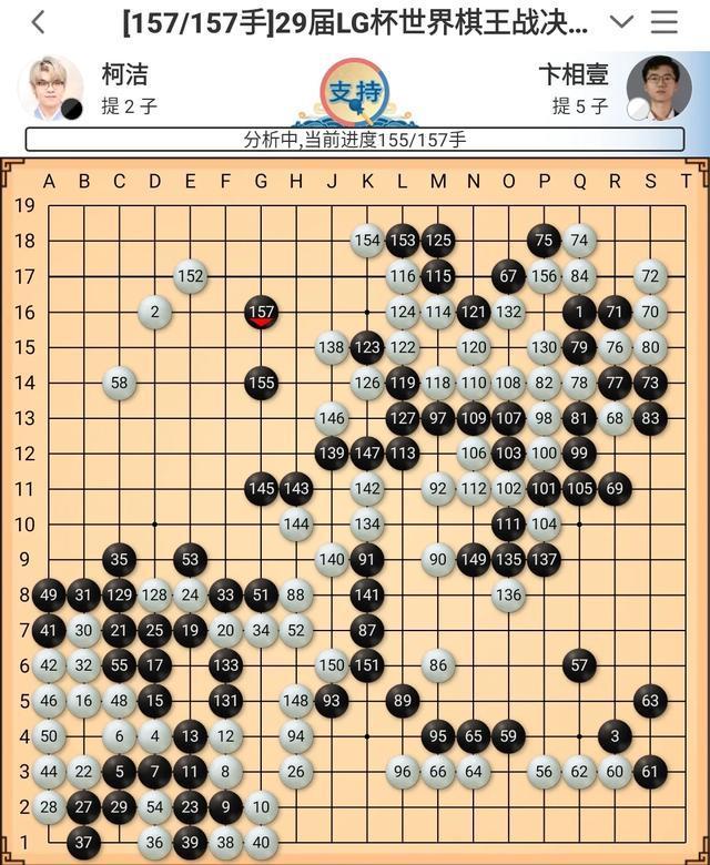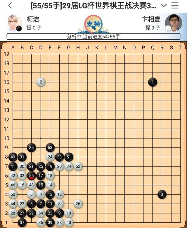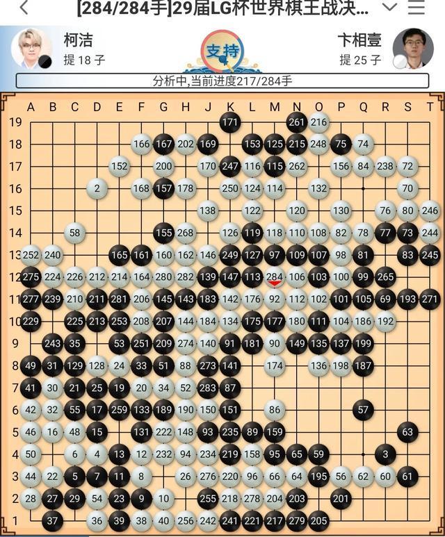 最终,柯洁执黑284手中盘战胜卞相壹,拿到了第29届LG杯世界棋王战的赛点。