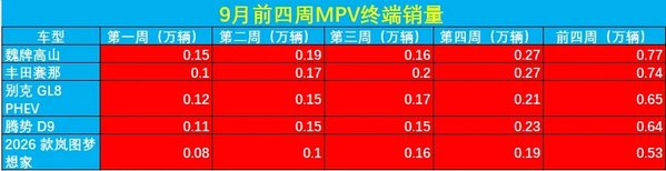 若以当前数据推演,魏牌高山凭借前三周的微弱优势,成为 9 月销冠的可能性更大 —— 毕竟在新能源渗透率已达 58.1% 的 9 月车市,自主高端 MPV 的增长势能已明显盖过传统合资车型。
