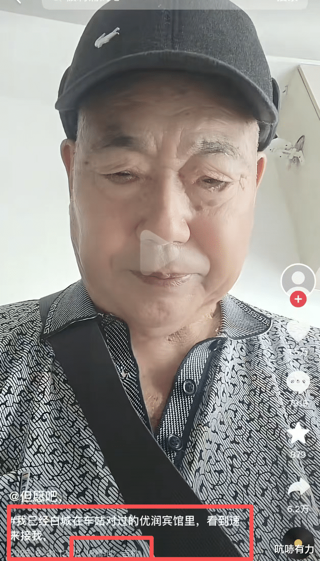 2025年8月31日,大爷IP属地显示为吉林,发视频称:“我已经在白城车站对过的优润宾馆里,看到速来接我!”