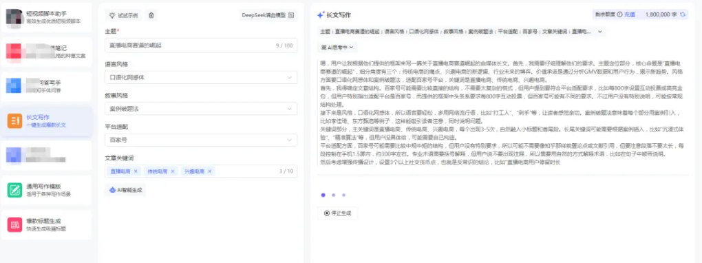融媒宝接入了国产大模型DeepSeek R1,内嵌了AI视频混剪系统与文案自动生成引擎。简单来说,你只需提供一组视频素材(或关键词),系统便能自动识别逻辑片段,加入转场、字幕、自动配音,并按预设生成视频,同时支持批量处理。