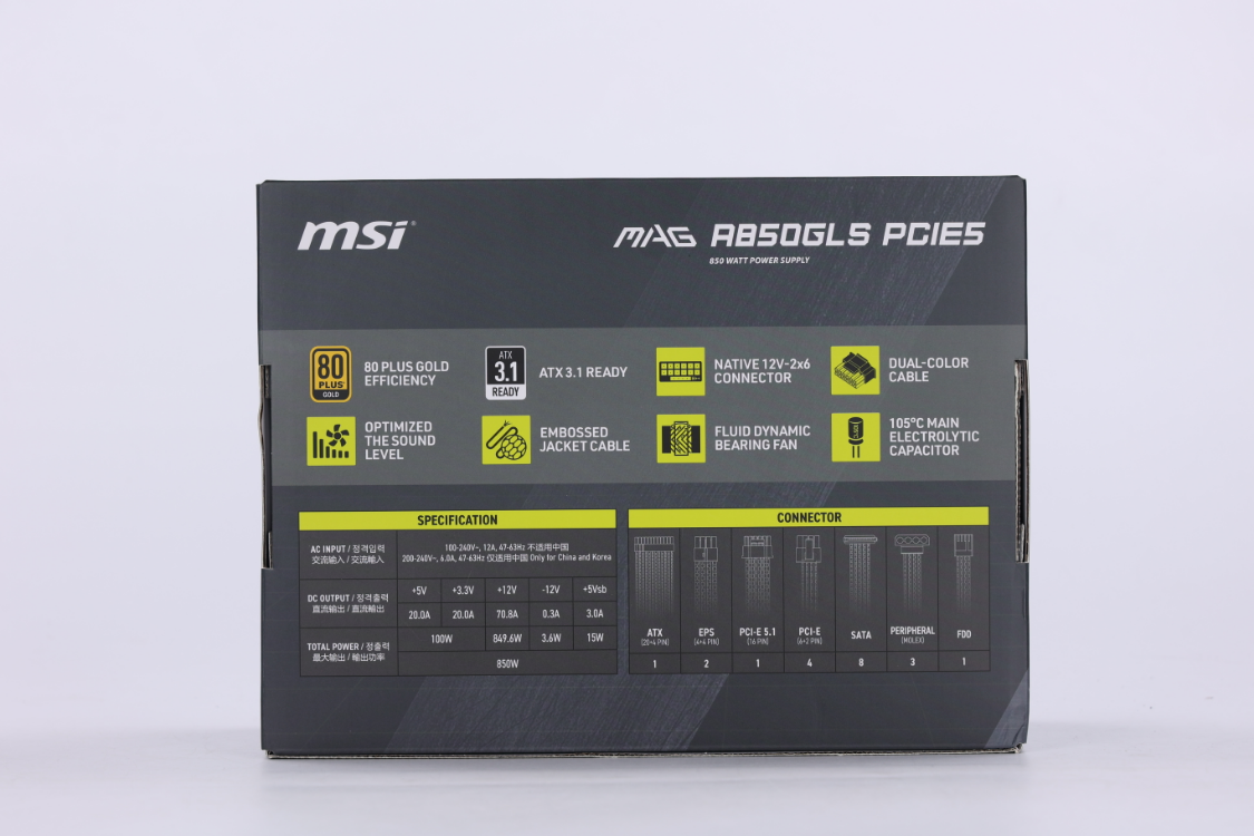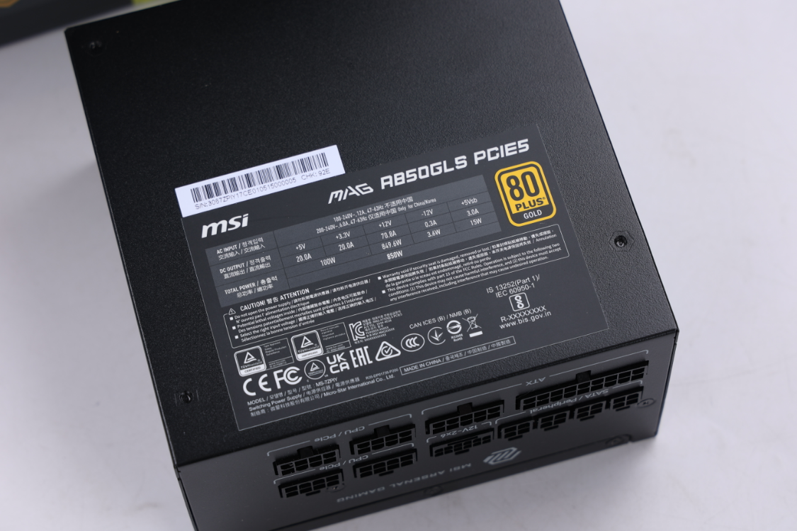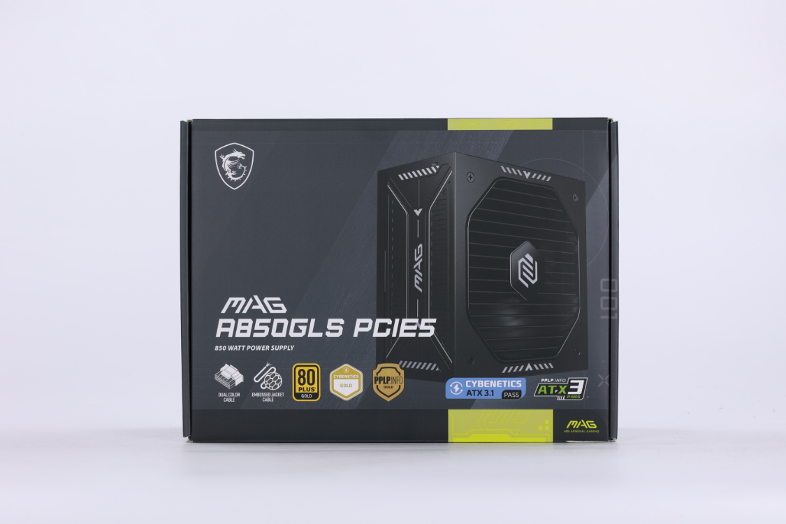 MAG A850GLS PCIE5电源跟早先咱入手过的MAG A850GL PCIE5电源外包装设计风格类似,同样是科技灰为底色,电源本体渲染图和80Plus金牌认证等标识也都非常抢眼。此外,包装表面还有MAG系列代表的黄绿配色的电路纹色块装饰。