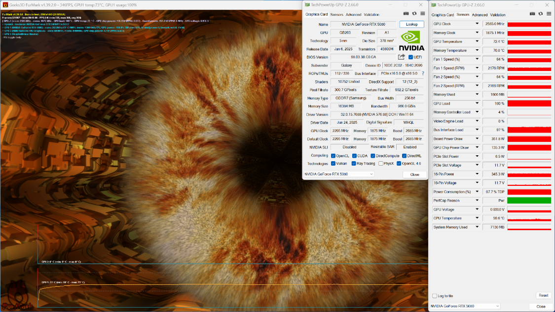 Furmark烤机测试,烤机15Min后,显卡功耗为350W左右,显卡温度为70°左右,整机实际功耗为490W左右;