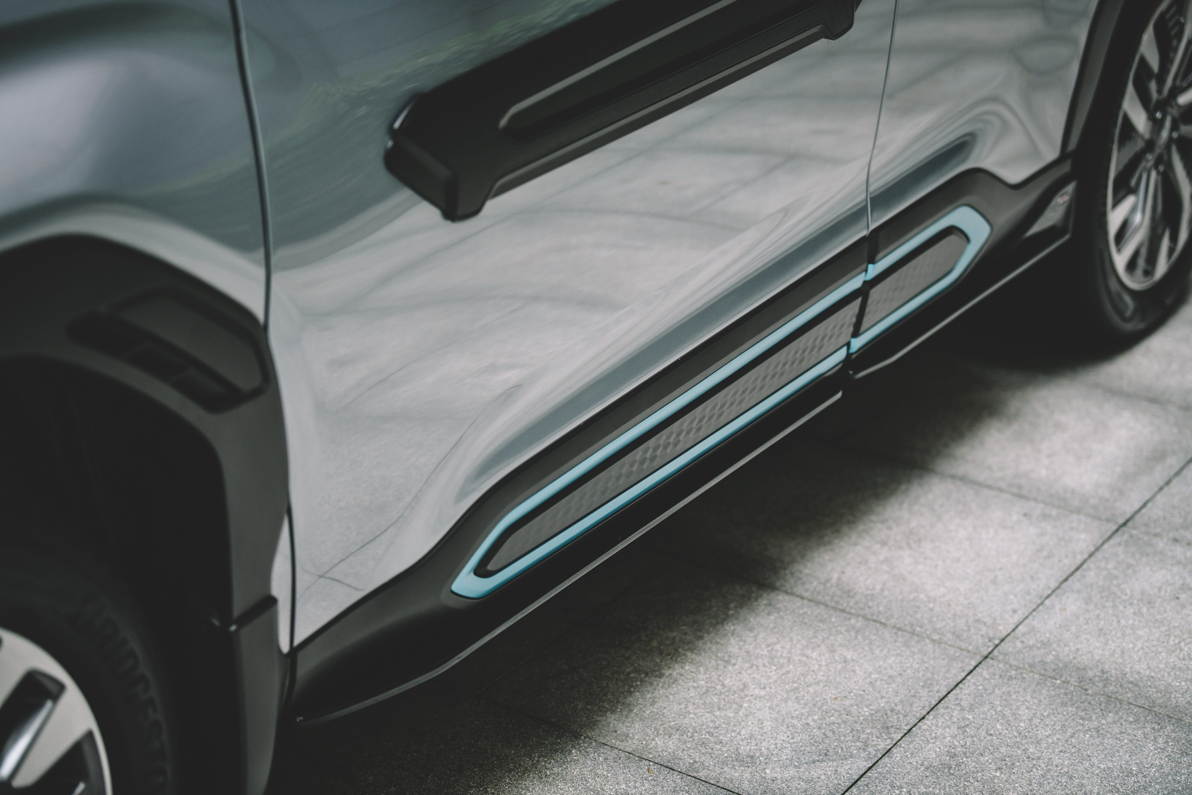 尾门字母标提供哑光银/黑两种配色选择,通过塑料涂装工艺在原车凹形车名标识处粘贴,使“FORESTER”标识更为立体醒目。行李箱装饰踏板提供金属材质(SUS)和树脂材质两种选择,粘贴在后保险杠表面,可有效保护保险杠在装卸货物时可能出现的擦伤。后保险杠装饰件则使用原车设计风格,搭配绿松石蓝配色,为车尾带来了个性化的点缀。