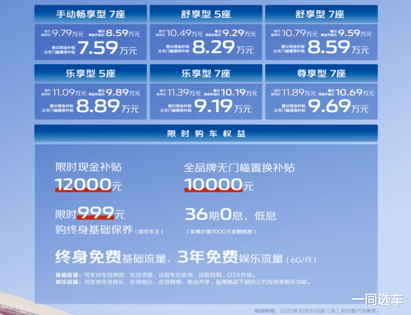 七座版的入门版指导价9.79万元,特点是手动挡,这就需要一定的驾驶习惯;增加1万元到次低配,升级了7DCT变速箱、540全景影像、天枢智能座舱、主驾电动调节等;增加6k元到次顶配,升级L2全速自适应巡航,以及前碰撞预警等主动安全系统;增加5k元到顶配,除了进一步增加倒车预警、开门预警等功能,还增加了主驾加热、通风功能,副驾电动调节。