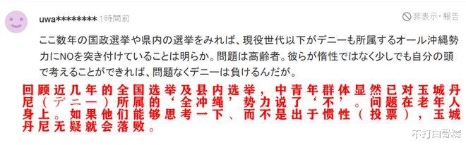 此外,被新闻搞破防、要求玉城丹尼辞职的人有一大把,但大多数都只是情绪发泄,只有一段留言引起了我们的关注:回顾近几年的全国选举及县内选举,中青年群体显然已对玉城丹尼(デニー)所属的‘全冲绳’势力说了‘不’。问题在老年人身上。如果他们能够思考一下、而不是出于惯性(投票),玉城丹尼无疑就会落败。
