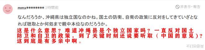 这番话在日语的语境当中,是比较正式和客气的请求,听起来没什么问题,但潜台词其实是在内涵日本政府。因为日语的表达特征就是委婉、间接,或者说非常暧昧、喜欢绕圈子,外国人听不出来,他们本国人却一听就明白。所以日本网友一看新闻就暴走了,有人留言说:这是什么意思?难道冲绳县是个独立国家吗?一直反对国土防卫和自卫的政策,到了关键时刻却说要听取中国的意见,这到底是有多亲中啊。