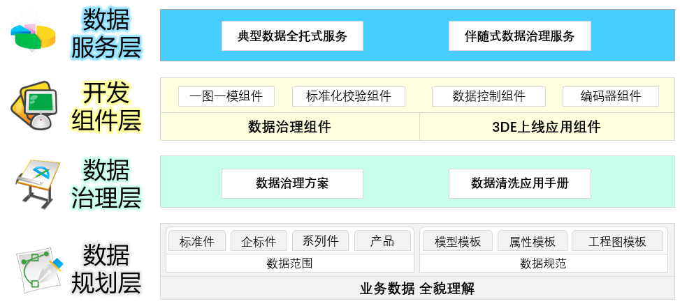 (1)数据规划层:基于企业规范文件、数据模板、标准件、企标件等基础数据模型,开展项目最初的路线设计与行动决策,形成攻克项目初期面临的数据整合、治理或应用难题的方法论与执行路线图。