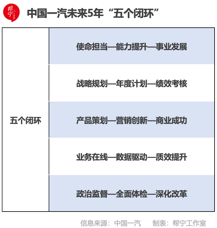 在此基础上,针对未来5年,中国一汽在管理体制和运营机制上,提出“五个闭环”,进一步强化战略导向、结果导向,核心逻辑是通过计划-执行-考核全链路管控,确保战略目标落地。