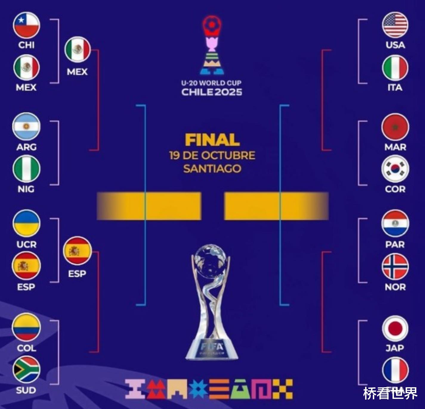 世青赛(U20 世界杯)1/8 决赛已正式打响,西班牙队 1-0 击败乌克兰队,成为首支晋级八强的球队。接下来西班牙将等待南非队与哥伦比亚队之间的胜者。不久后,墨西哥队 4-1 大胜智利队,如果阿根廷队能顺利晋级下一轮,墨西哥队将成为阿根廷队的对手。